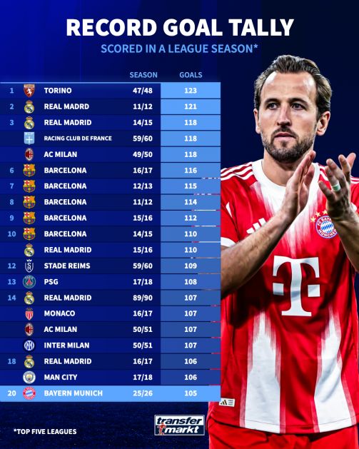 五大联赛单赛季进球纪录,拜仁这季有望打破