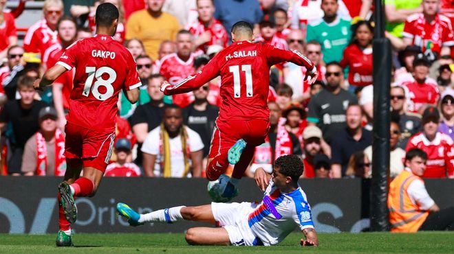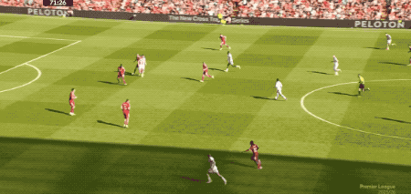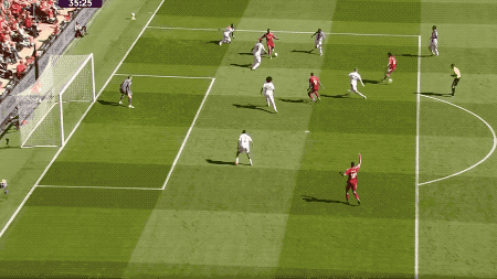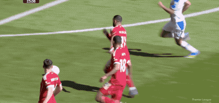 第23分钟,接到维尔茨的妙传,萨拉赫高速突入禁区,布伦南约翰逊放铲,萨拉赫倒在了禁区内,裁判第一时间判罚点球,VAR介入后,裁判取消判罚。